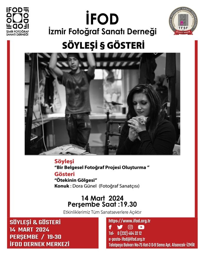 14 Mart 2024 Perşembe akşamı saat 19:30’da Fotoğraf Sanatçısı Dora Günel ‘’Bir Belgesel Fotoğraf Projesi Oluşturma’’ isimli söyleşi ve ‘’Ötetinin Gölgesi’’ isimli fotoğraf sunumu gerçekleştirecek.