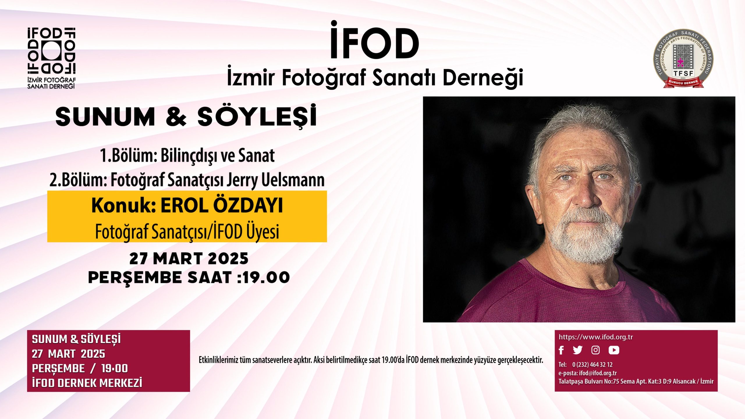 27 Mart Perşembe saat 19:00 da fotoğraf sanatçısı Erol Özdayı ile “ Bilinçdışı ve Sanat” ve “Fotoğraf Sanatçısı Jerry Uelsmann”isimli sunum ve söyleşi ile gerçekleştireceğiz katılımınızı bekleriz.